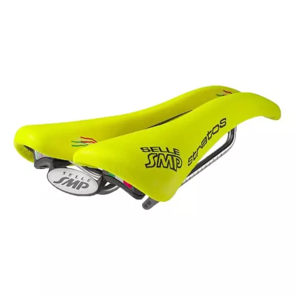 Sella Selle SMP Stratos che utilizza la struttura del modello Composit completato con un’imbottitura media. Rivestito in cuoio vero per le versioni di colore nero e Microfibra di Lorica per le versioni di colore Presenta caratteristiche “allround” ideali ed è particolarmente adatto ai bacini con conformazione anatomica media. Il modello Stratos è imbottito con elastomero nei punti di appoggio della tuberosità ischiatica e glutei. Le caratteristiche brevettate di Selle SMP quali il canale centrale completamente libero, l’originale naso a forma di becco d’aquila e l’elevazione della parte posteriore conferiscono a questi modelli un interessante tocco di aerodinamicità. Grazie alla combinazione di imbottitura leggera ma comoda con un casco di larghezza ridotta, Stratos rappresenta la soluzione intermedia ideale tra i modelli Evolution e Glider. Adatto per persone con bacino stretto e medio.