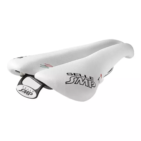 La sella Selle SMP Triathlon T1 con binari di carbonio è il modello di maggiori dimensioni della gamma di selle da triathlon ed è consigliata per i ciclisti con il bacino largo. È rivestito in vera pelle nelle versioni in colore nero e di microfibra di Lorica per le versioni a colori.